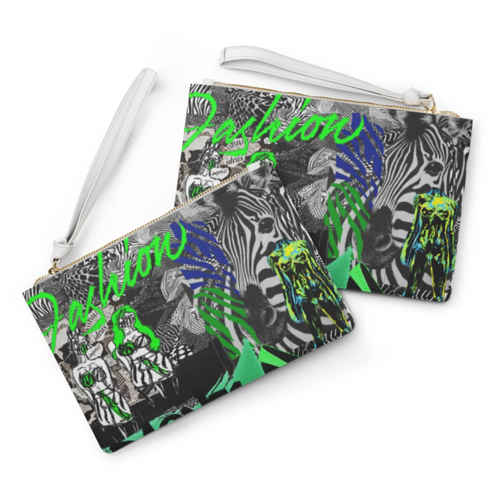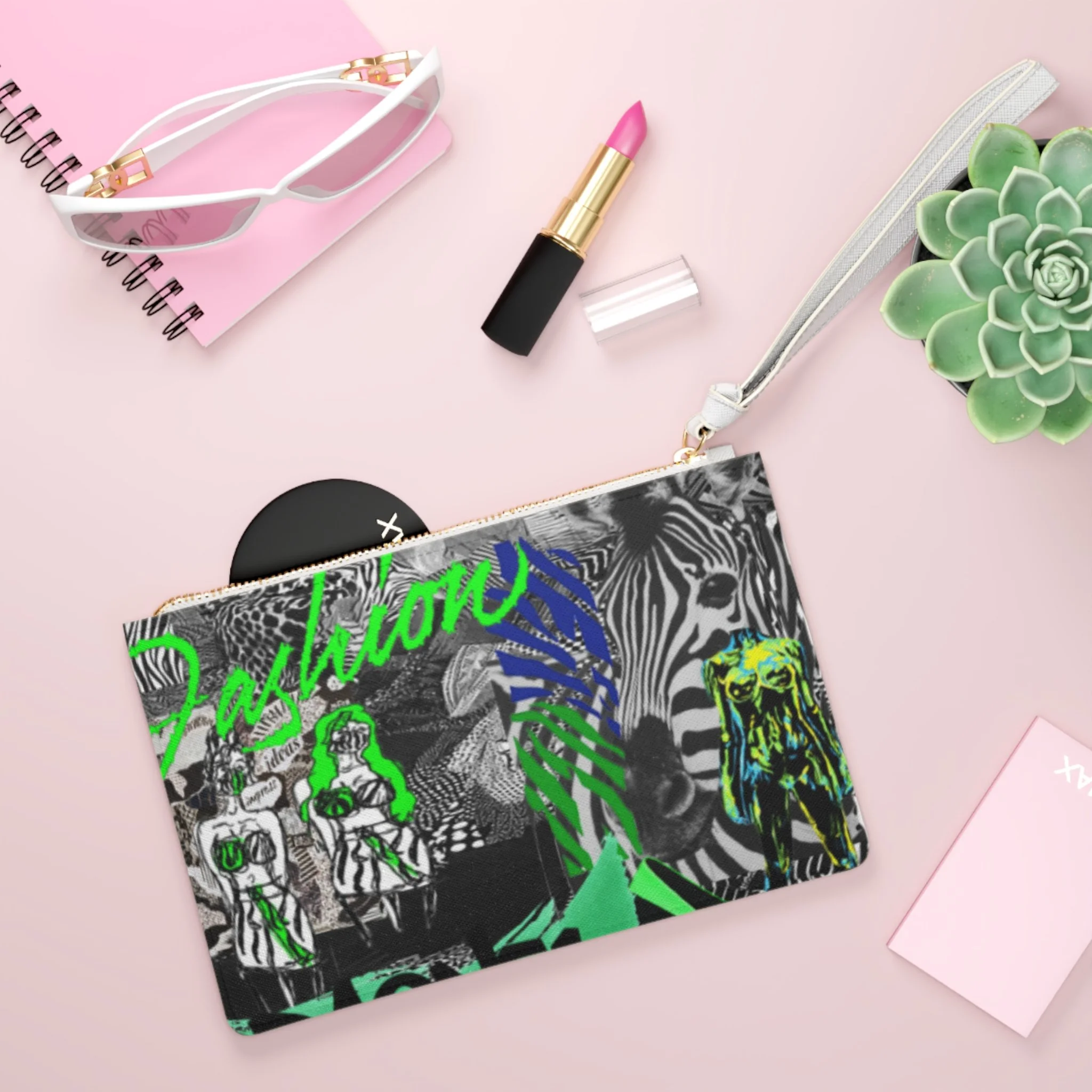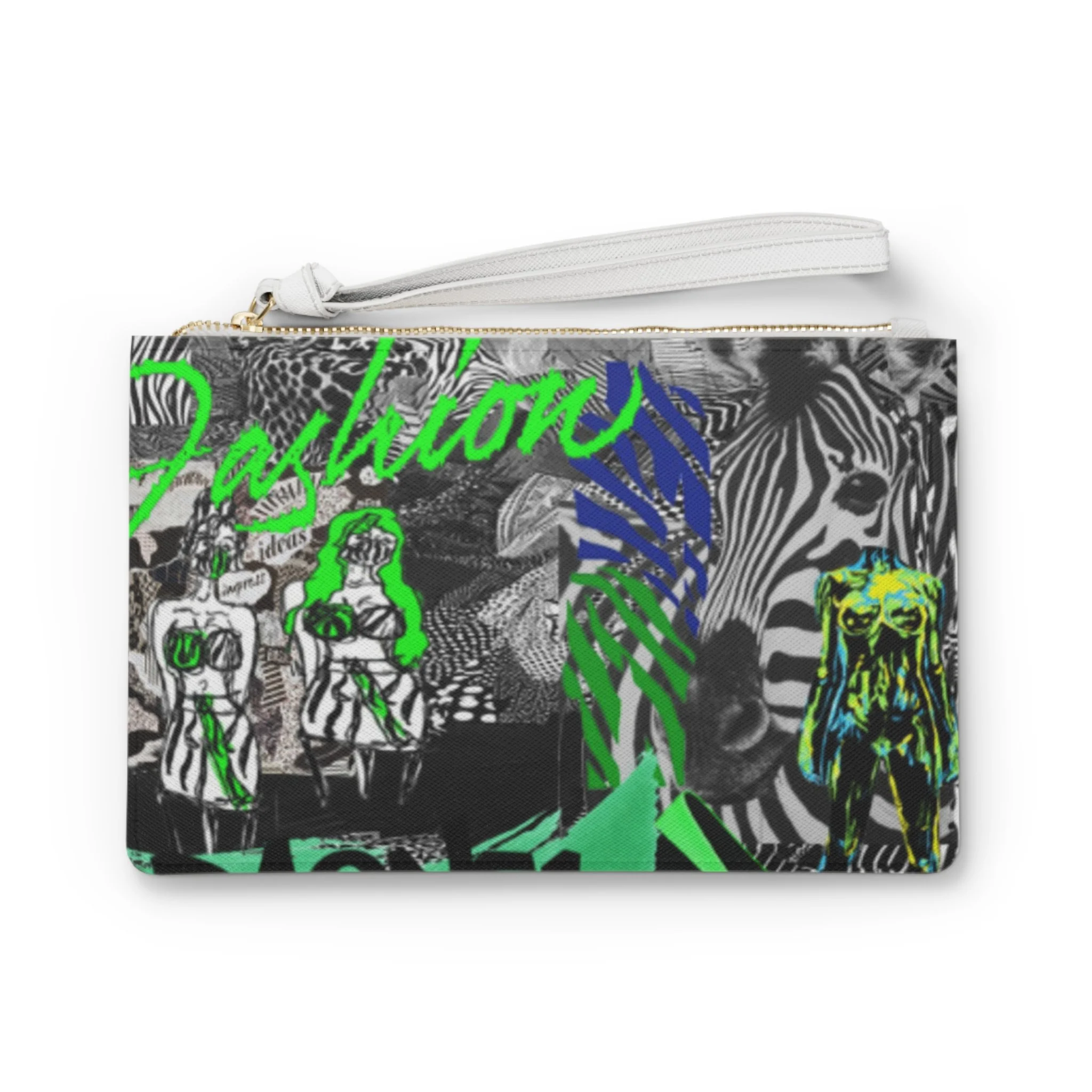 A bold, art-forward clutch that brings street-style energy to evening looks. This slim wristlet pairs a Saffiano-textured faux leather body with a gold zipper and wrist strap for effortless carry. The print layers neon green and electric blue graffiti-style text and abstract figures over black-and-white zebra motifs—playful, slightly rebellious, and unmistakably modern. Inside, two compartments and a small pocket keep phone, cards, and lipstick organized against a sleek black lining. Wear it when you want an accessory that reads like art: confident, graphic, and alive.