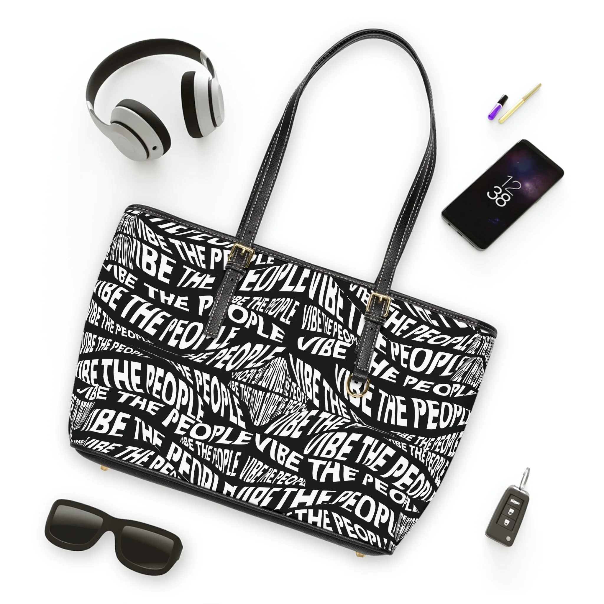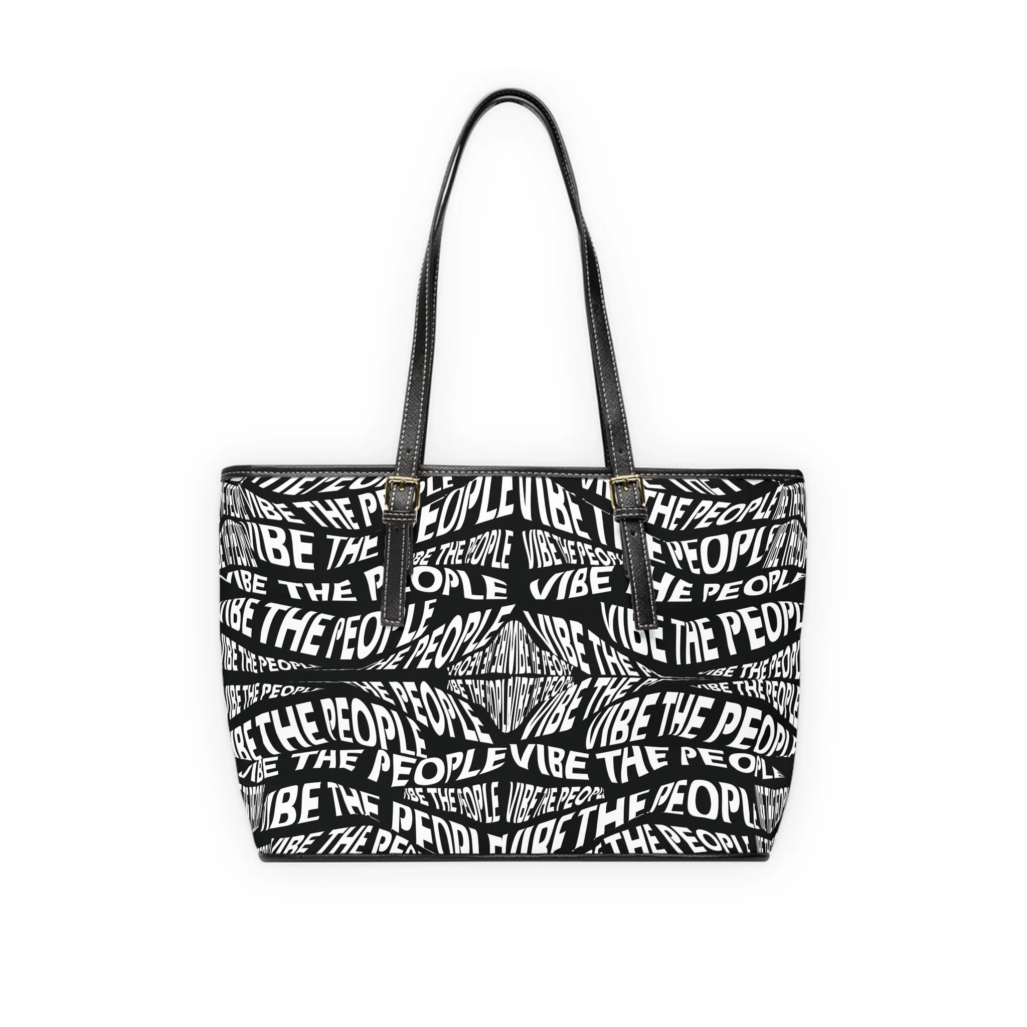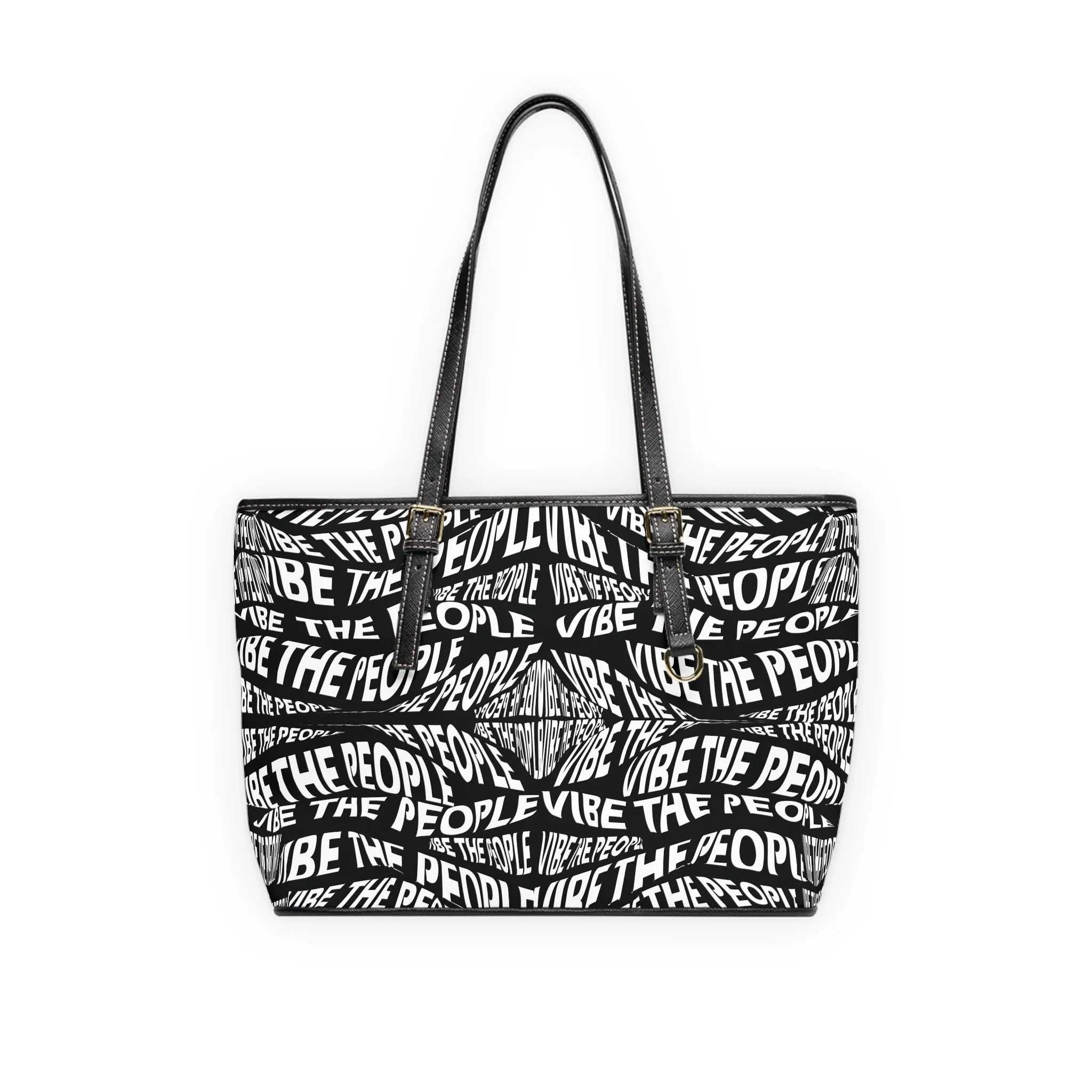 A bold, graphic shoulder tote that speaks with attitude. Crafted from high-grade PU leather with a soft polyester lining, this double-sided bag carries a loud black-and-white mantra print — repeating “VIBE THE PEOPLE” in hand-lettered strokes that ripple across the surface. The long, adjustable straps sit comfortably on shoulder or crook of arm. Inside, a zip pocket and two open pockets keep phone, keys, and wallet organized. Gold-toned hardware adds a subtle shine against the monochrome palette. This bag moves from street markets to late-night gigs, bringing structure and swagger to everyday carry.